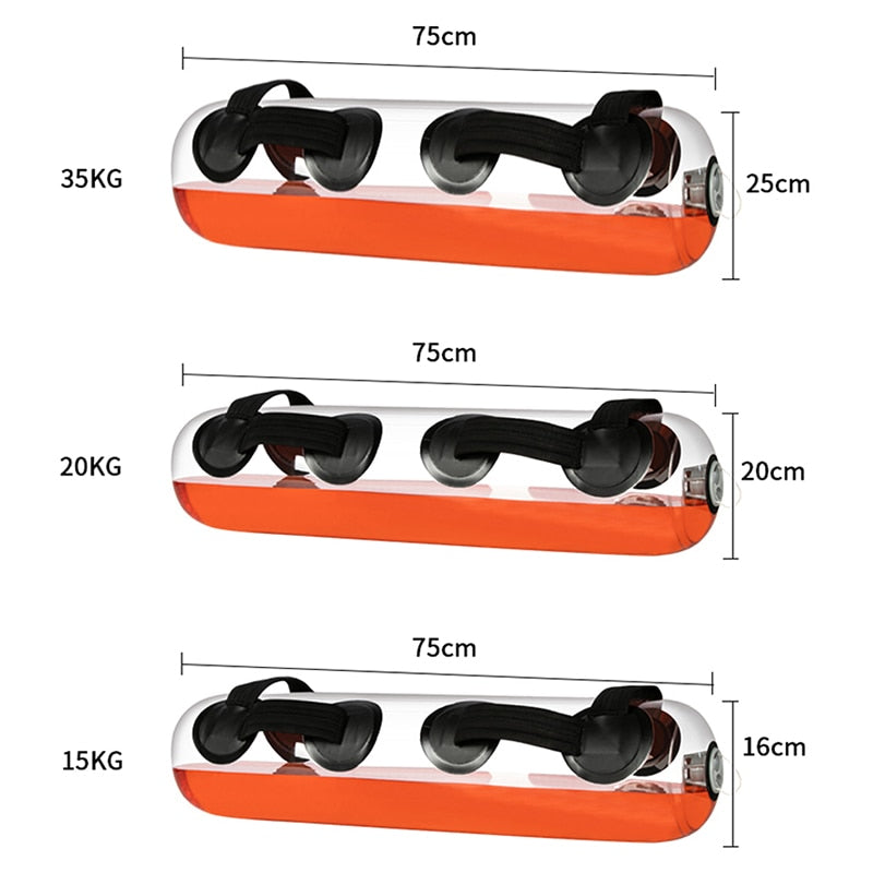 The bags are all empty, please fill it by yourself :)You can put only water into the bag. Please be sure you are using it on a smooth floor otherwise the bag may damaged and please do not overload the bag. There is a MAX line on the bag, please DO NOT beyond the line. So there might beno dyes in the package because we have removed away before shipping. If you like a colorful water bag, you may need to find a dye in your own country. 1. Turn on the faucet, and put 1/3 water into the bag at first.2. Use the inflator to pump up the bag.3. Verify the air tightness.4. If everything is okay, put more water into the bag and pump up again.Package Includes: 1 bag, 1 inflator, 1 rule paper Age: 14+ Quality: High classColor: TransparentSize(cm):15kg 16*75cm, 20kg 20*75cm, 35kg 25*75cm(Manual measurement +-1cm)Net Weight(g):1100-1400g (+-20g)Materials: PVCAges under 14 may cause danger